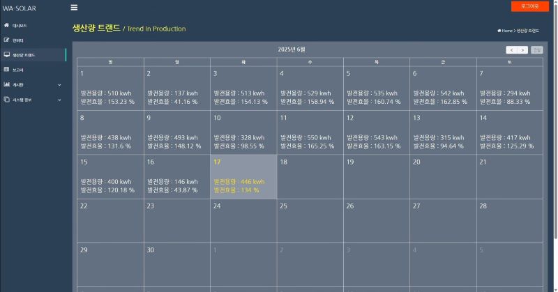 - 달력 형태의 일별 발전량 및 발전 효율 확인
